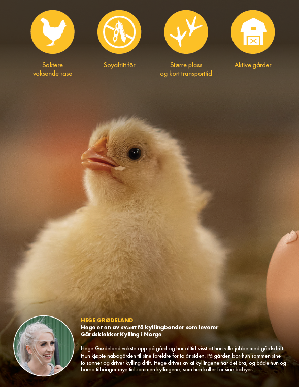 Våre gårdsklekkede kyllinger klekkes og vokser opp på en av våre utvalgte gårder, slik at de får en trygg og god start på livet. De vokser saktere, har mer plass og får soyafritt fôr.