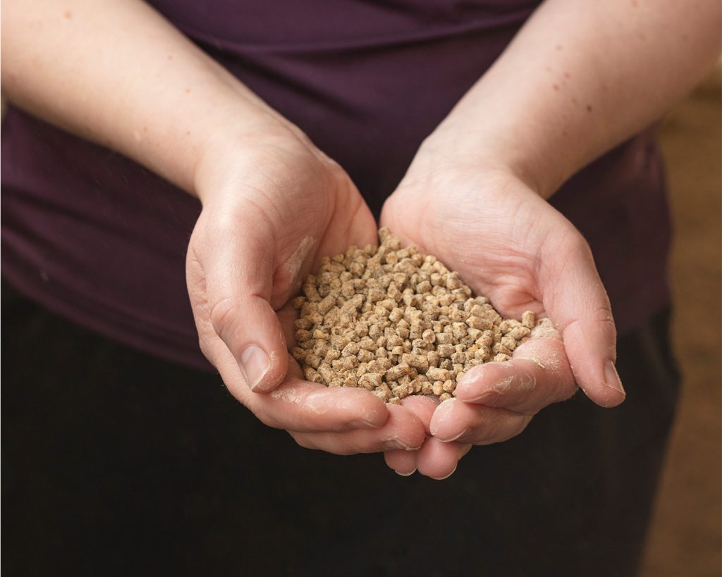 Vi ønsker å ha størt mulig norskandel i fôret. Fra naturens side er kyllingen avhengig av et høyt inntak av protein og essensielle aminosyrer. Per i dag har ikke korn som dyrkes i Norge nok av de essensielle aminosyrene, og fôret har derfor soya som proteinkilde.