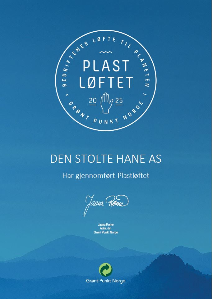 Den Stolte Hane er med i Plastløftet som er et initiativ fra Grønt Punkt Norge som oppfordrer norske bedrifter til å bidra til en mer sirkulær plastøkonomi. Plastløftet forplikter til å redusere mengden unødvendig plast, øke bruken av resirkulert plast og designe for gjenvinning. Dette har vært vårt mantra siden vi inngikk Plastløftet i 2018. I 2025 vant vi Holdbarhetsprisen for å legge til rette for mindre matsvinn og reduksjon av plast gjennom relansering av hele vårt grillede sortiment i storhusholdning.