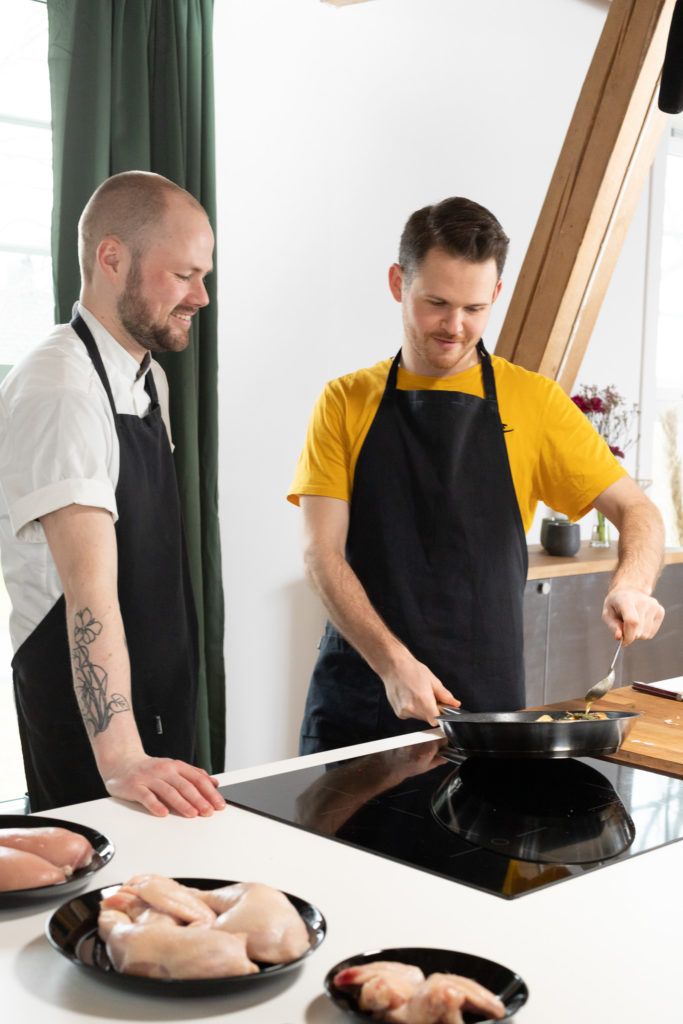 Sammen med vår entusiastiske Gårdsklekket-ambassadør, Johan, har vi fått være med å lage mat med Peder Støylen. Peder er utdannet kokk. Har erfaring fra Maemo og jobber til daglig som kjøkkensjef på den lille Hrimnir Ramen, som ligger i Maridalsveien i Oslo – og akkurat som oss elsker han kylling.