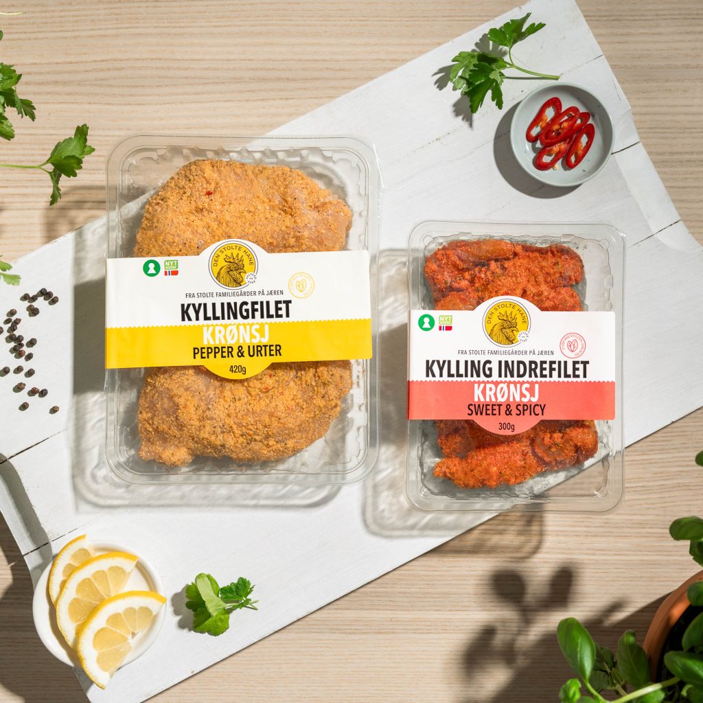 I 2025 lanserte Den Stolte Hane en helt ny serie med lett panert og ferdig krydret kylling! Vi stemmer for mindre jobb og mer Krønsj i hverdagen med god og saftig kylling. Det er to ulike varianter av Krønsj i butikken, velg mellom kyllingfilet med Pepper & urter eller Sweet & Spicy kylling indrefilet.