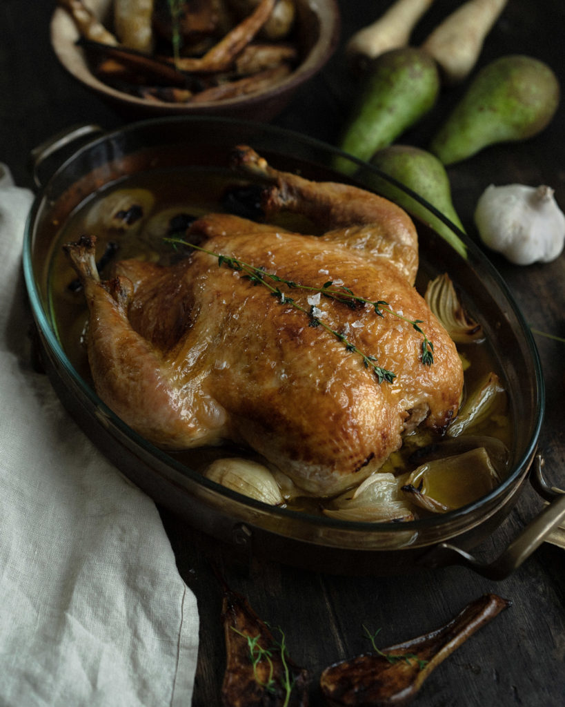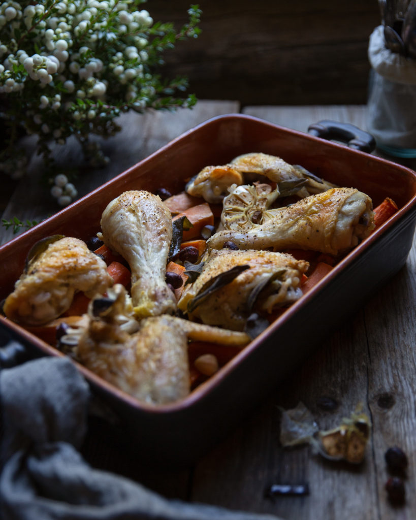 Ovnsgrillet hel kylling stykket opp før steking, på en seng av med rotgrønnsaker, hasselnøtter og salvie.