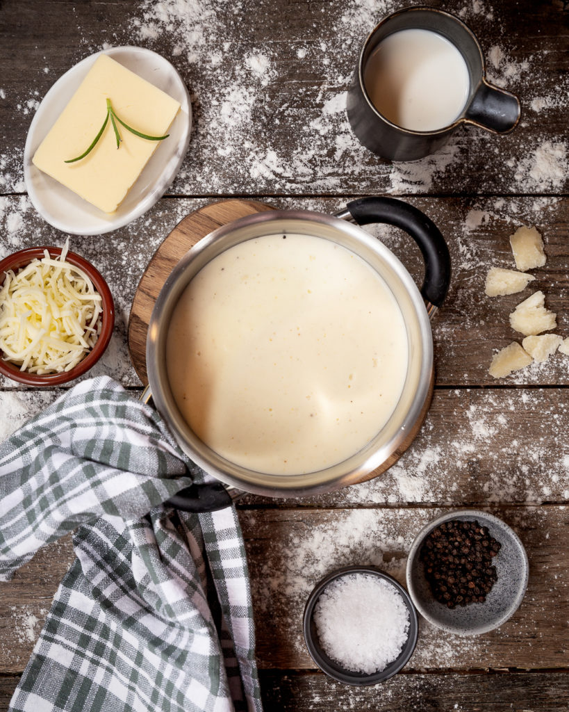Tilsett melk og kok opp i 2-3 minutter til sausen er jevn og har fått en fyldig konsistens.