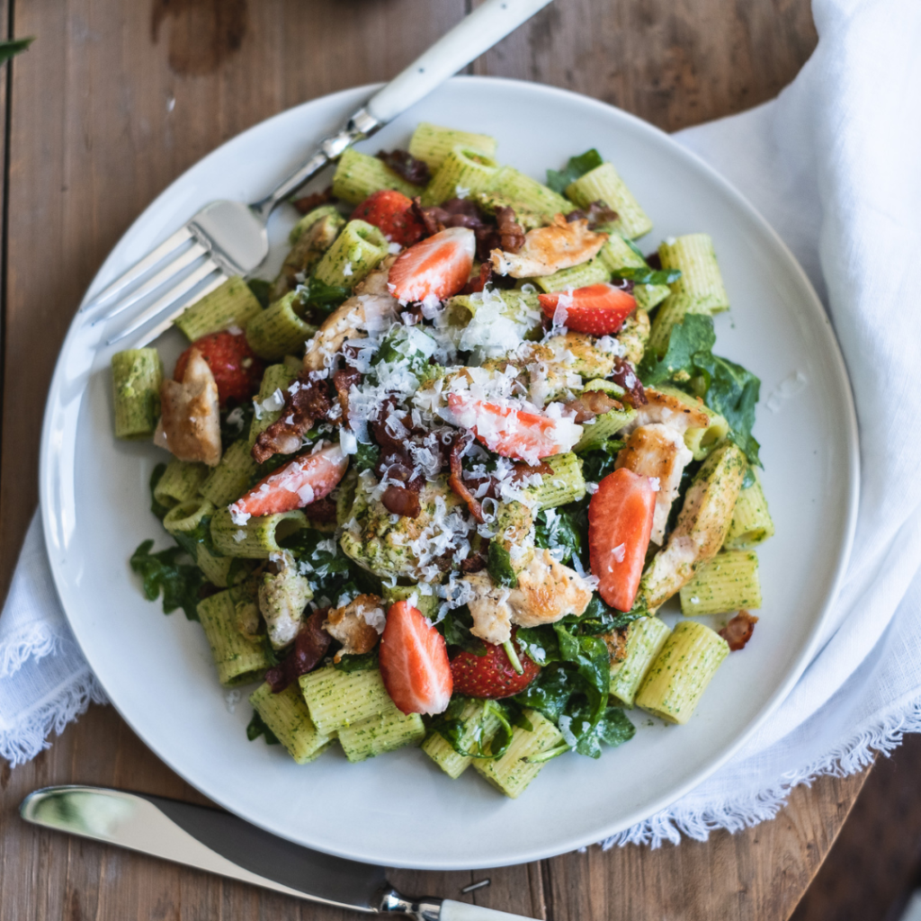 Lun pastasalat med stekt kyllingfilet, bacon og jordbær