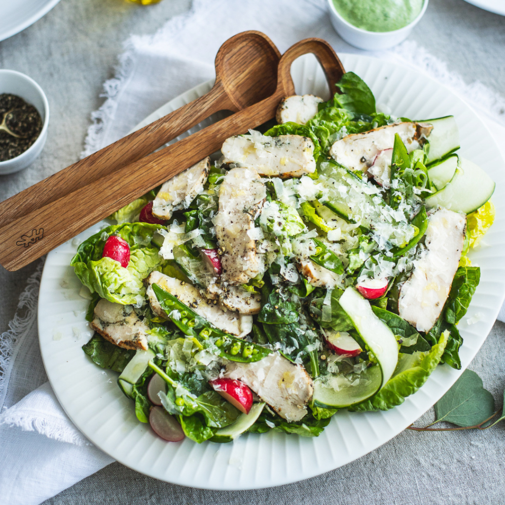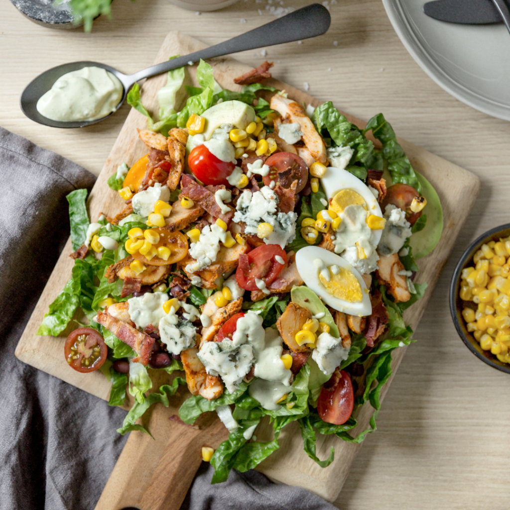 En mettende kyllingsalat med hjemmelaget dressing som passer til lunch eller middag.
