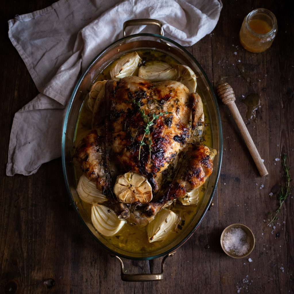 Langtidsstekt kylling med urter, sitron og honning. Dette er et festmåltid med deilig helstekt kylling.