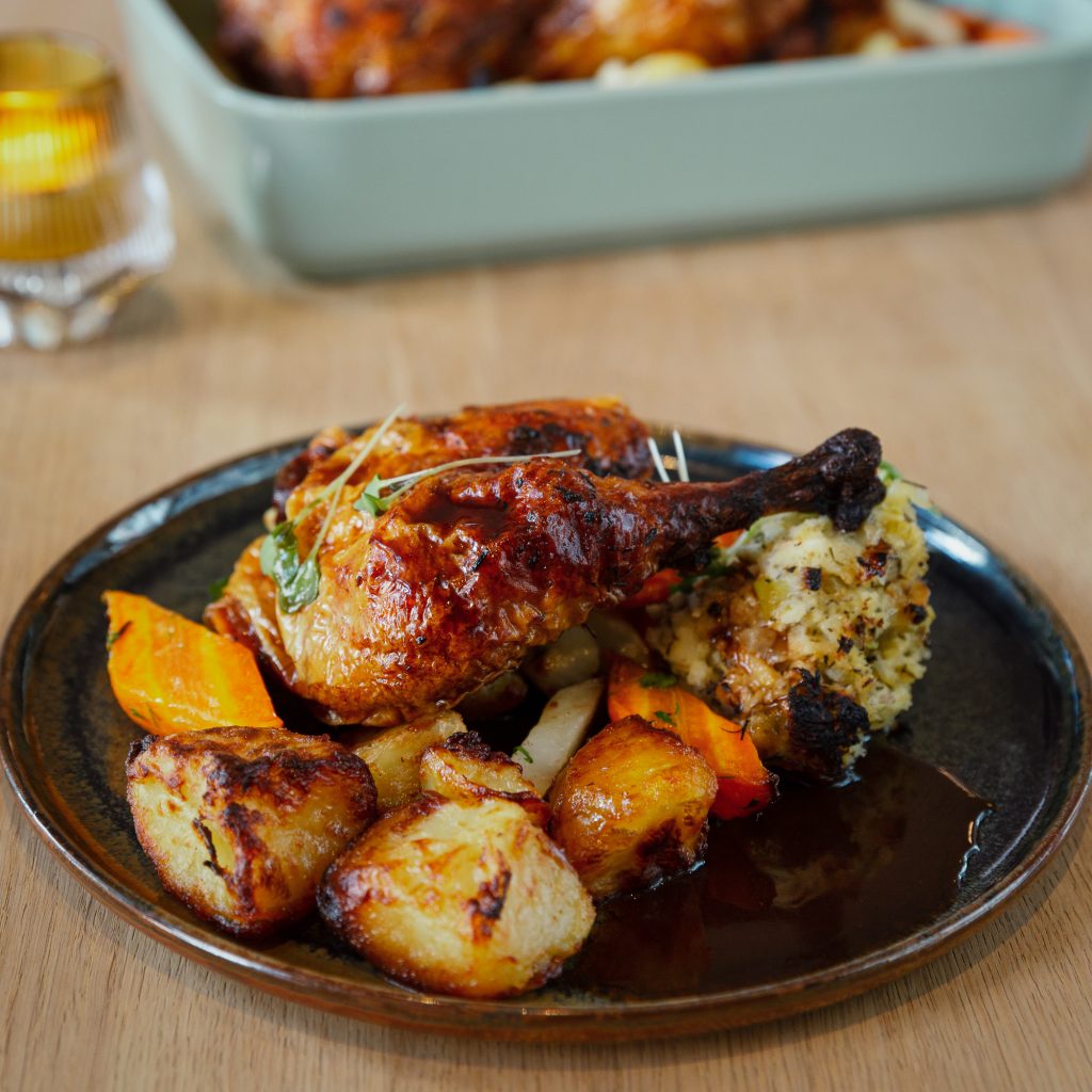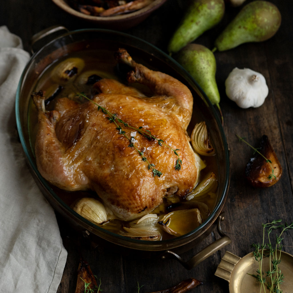Festkylling stekt over 8 timer med saltbakte mandelpoteter, skysaus og karamelliserte pærer. En spinnede sammensetning som garantert kommer til å bli godt likt.