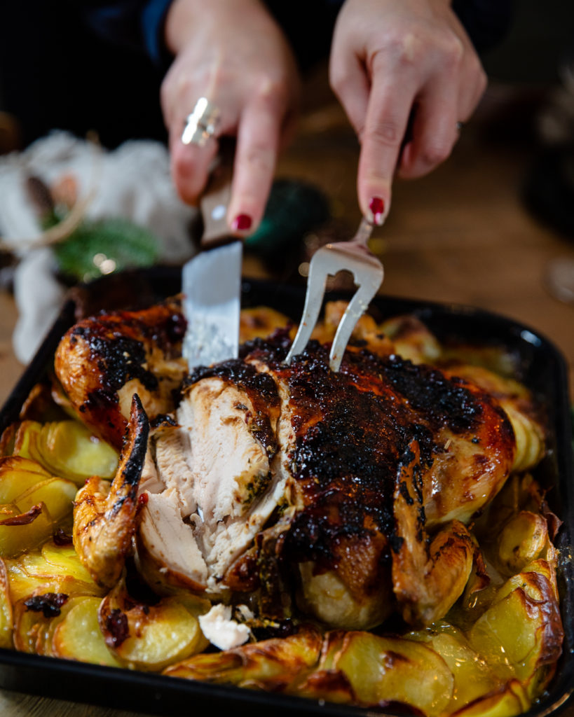 Denne retten er ekstra smakfull fordi den er marinert med en smørblanding av appelsinskall, rosmarin, timian og persille. Trikset for ekstra saftig kylling er å smøre blandingen under skinnet. Serveres med skivede stekte poteter.