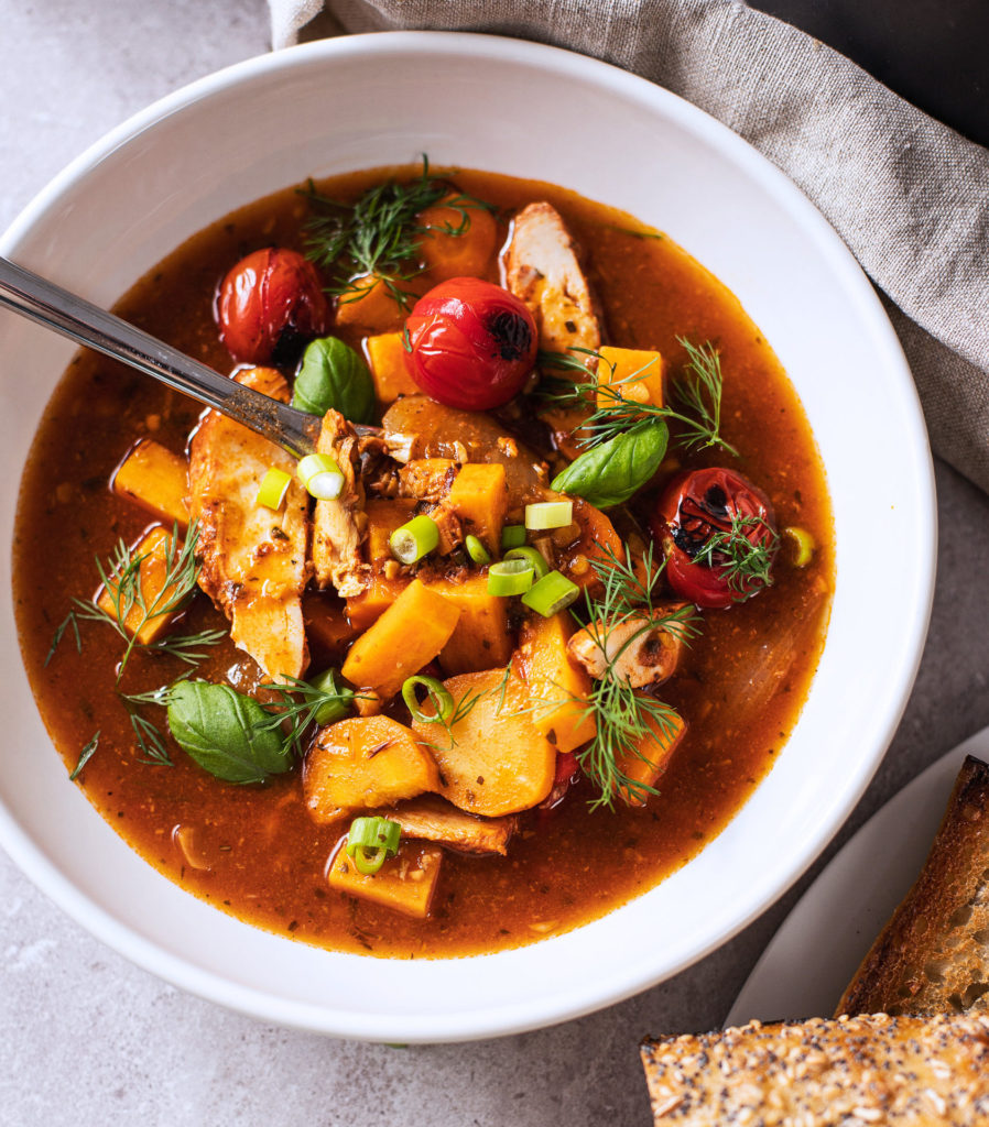 En deilig tomatisert kyllingsuppe med søtpotet og tomat. Denne kyllingsuppe er proppfull av gode grønnsaker, som gir energi og vitaminer i høstmørket. Lag til deg selv, eller hele familien. Denne blir godt likt av alle.