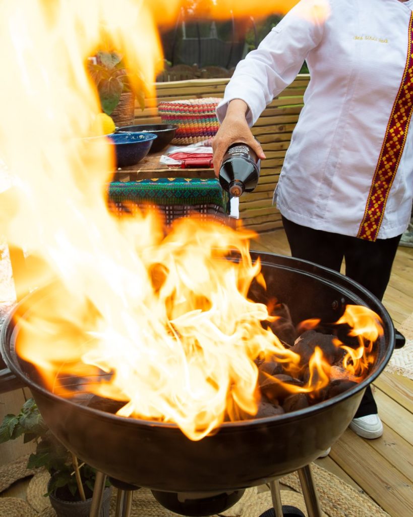 Sylvia har laget tre retter med kylling fra Den Stolte Hane. Her har hun brukt hel kylling, lårfilet og brystfilet. Alt fra salsa, lefser og kylling har blitt laget på kullgrill, for å få den autentiske brente smaken på rettene.