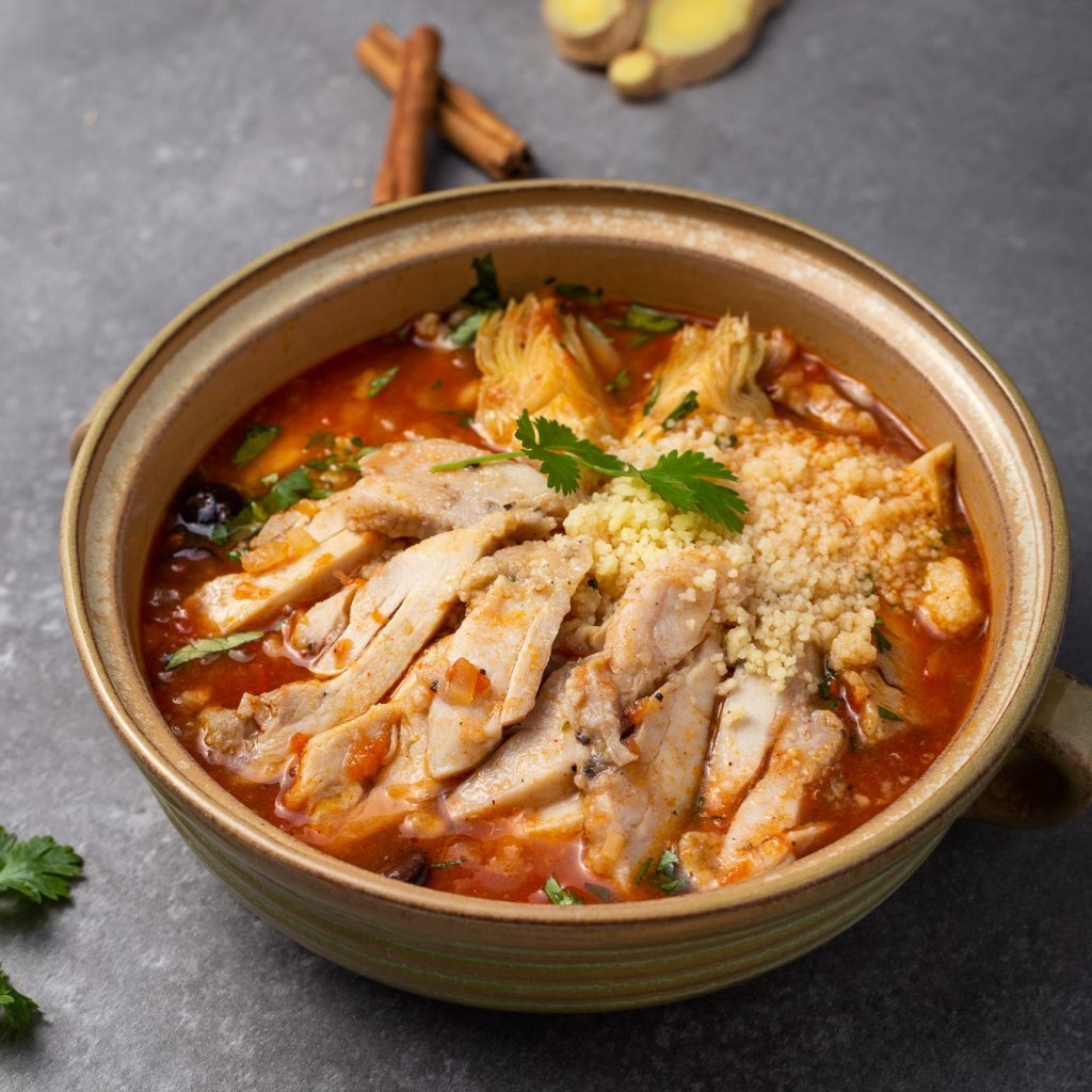 Oppdag den fortryllende smaken av marokkansk kyllingsuppe, en herlig rett som kombinerer saftig kylling med en spennende miks av krydder. Denne deilige suppen tar deg med på en smaksreise til Marrakech, med aromaer av koriander, spisskummen og kanel som fletter seg sammen i en herlig kraft.
