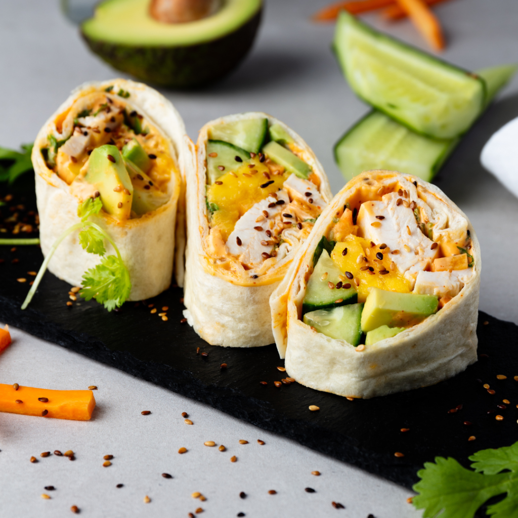 En asiatisk inspirert wrap med kylling, mango, avokado og chilimayo.