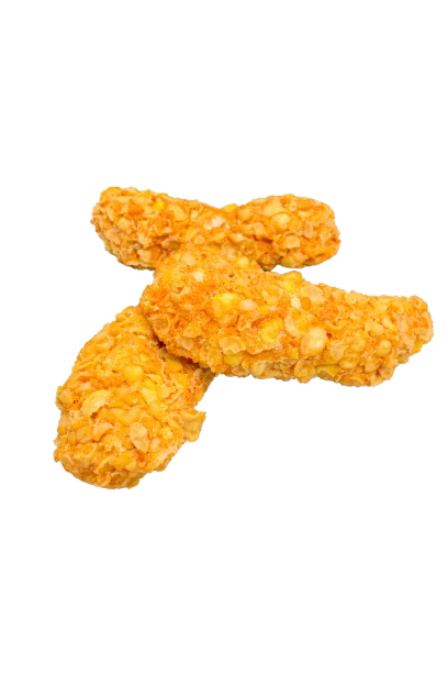 Kyllingkjøtt* 47%, Mekanisk utbenet kyllingkjøtt* 43%, cornflakes (mais, sukker, salt, maltekstrakt (bygg)), vann, vegetabilsk olje (solsikke, raps), hvetemel, hvetesemulegryn, potetstivelse, krydder (sort pepper, paprika, hvitløk, selleri, fennikel, kanel, muskat), salt, hveteprotein, gjærekstrakt, hevemidler (E450, E500), paprikaekstrakt, løkpulver, urter (oregano, timian). *Opprinnelse: Norge.