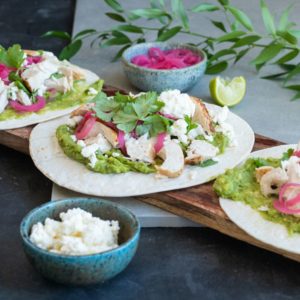 Topp lefser med most avocado, kylling, syltet rødløk, fetaost og friske urter. Skvis over litt lime og nyt!