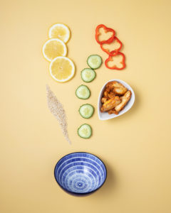 Bland sammen quinoa, spiseklar lårfilet, paprika og agurk.