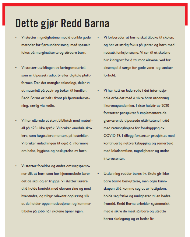 Vi valgte derfor å gi pengene til et øremerket prosjekt i Malawi, der Redd Barna har et prosjekt for å gi skolegang og bedret læringsutbytte. Dette har vært et svært viktig prosjekt, spesielt i 2020, da utfordringer knyttet til Covid-19 har blitt en tilleggsfaktor for hjelpearbeid.